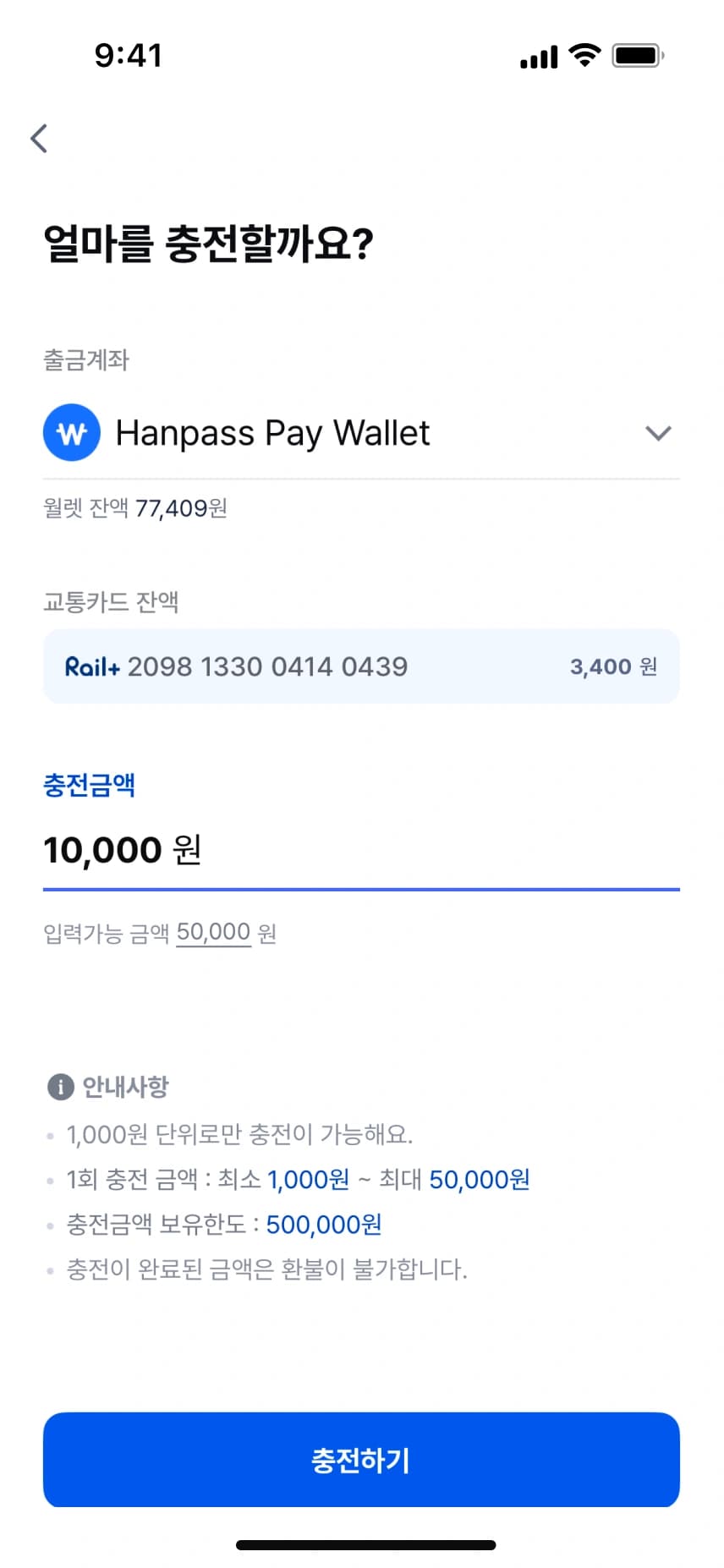 • 계좌 충전 : 연동 계좌와 가상계좌로 언제든지 간편하게 한패스 월렛 충전!